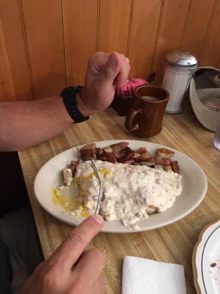 3 eggs served on a biscuit, topped with sausage gravy and serve with home fries.